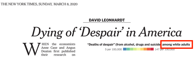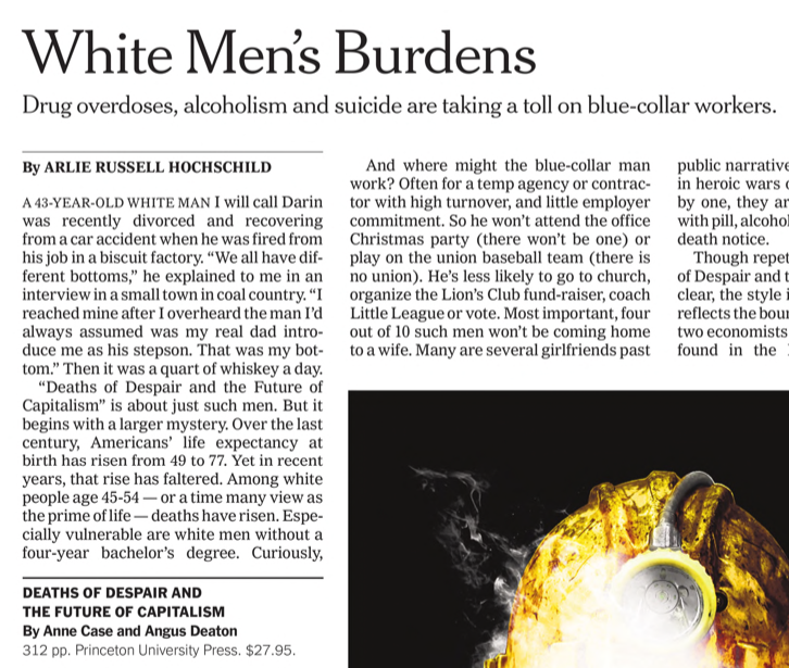 Our contribution was to link drug overdoses, suicides, and alcohol-related deaths, to note that all were rising together, that together they were afflicting mostly whites, and that, among that group, the long fall in total mortality had stopped or reversed. We also chose the collective label “deaths of despair,” which helped publicize the combined epidemic and emphasize that it included more than just drug overdose.