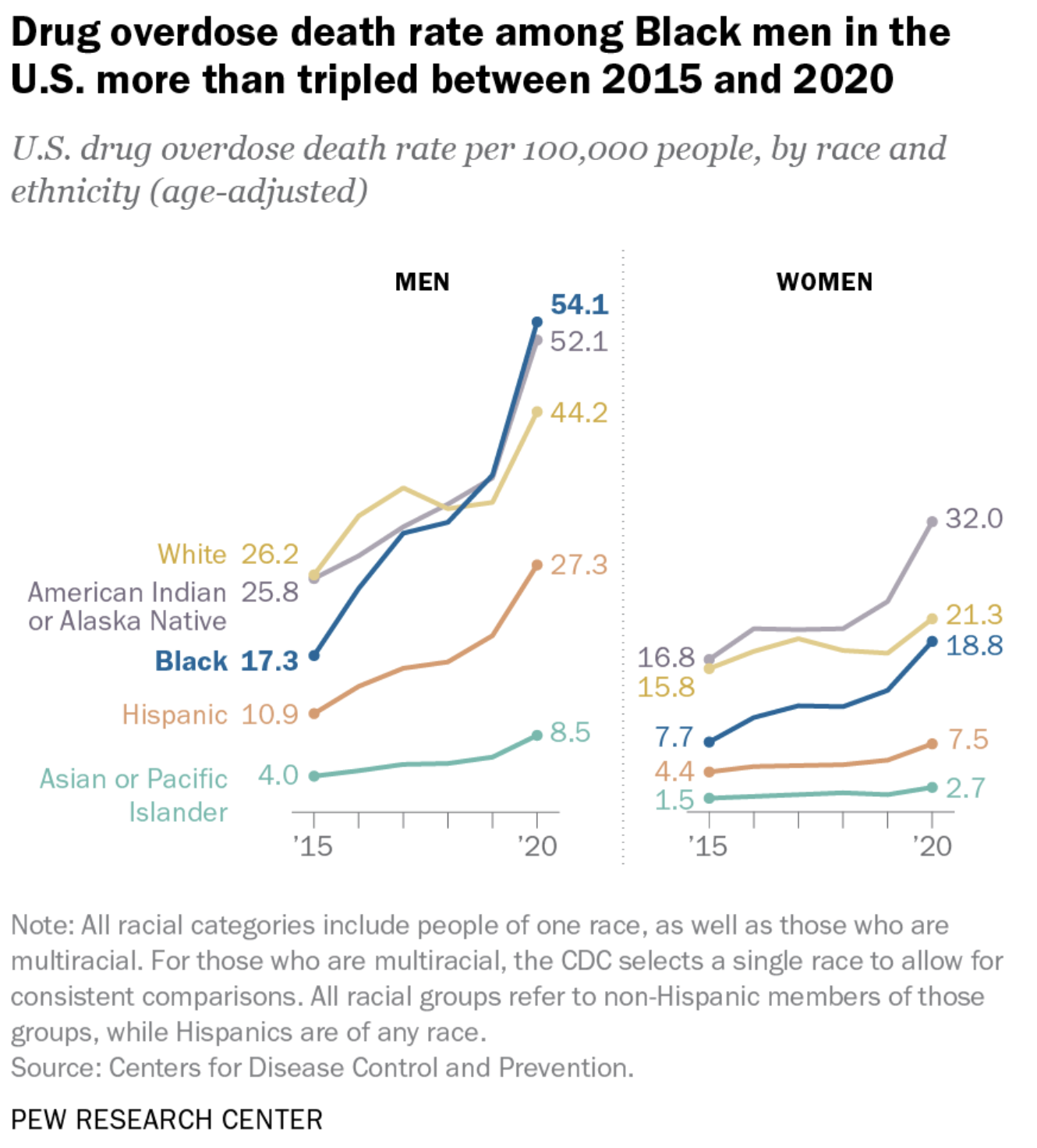 Much faster increases in opioid overdoses among Blacks and American Indian and Alaska Natives in recent years.