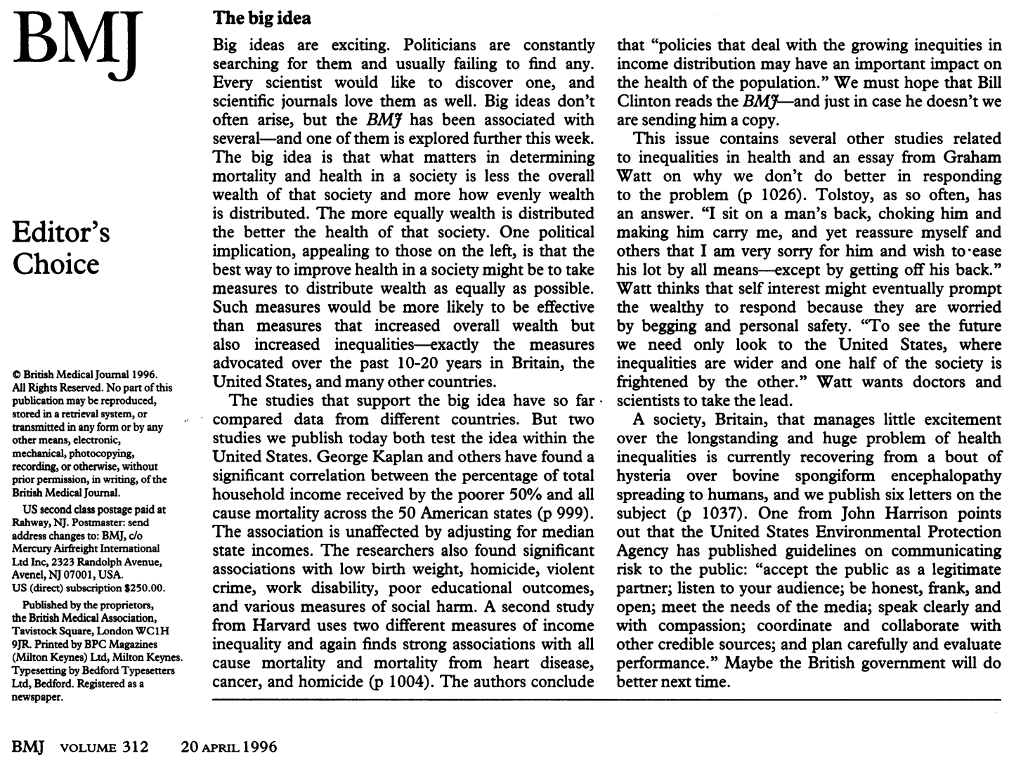 The big idea is that what matters in determining mortality and health in a society is less the overall wealth of that society and more how evenly wealth is distributed.