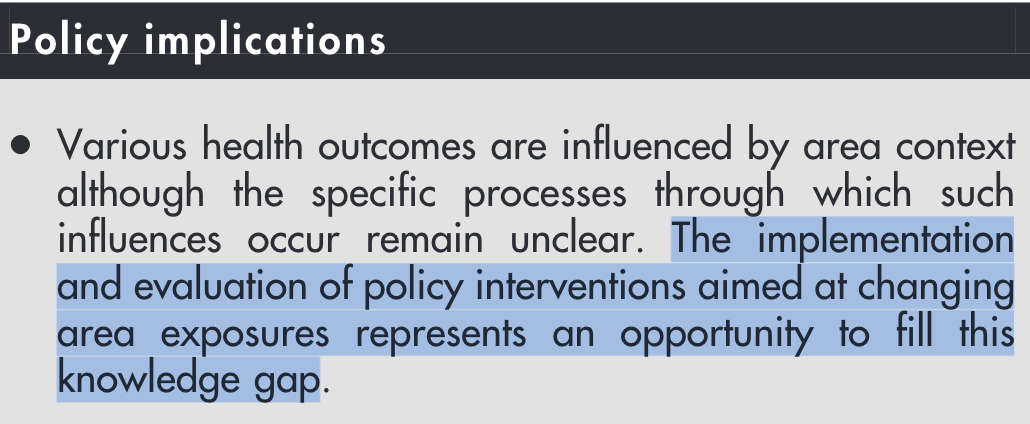 “it is not clear how much we are learning, or whether such lessons are improving population health…experimental evidence of neighborhood effects is mixed, and observational studies too often report mere correlations, side-stepping critical effect identification issues. Since epidemiologists have long known that disadvantaged environments are not healthy, the utility of studies that do not face the difficult methodological challenges is questionable”