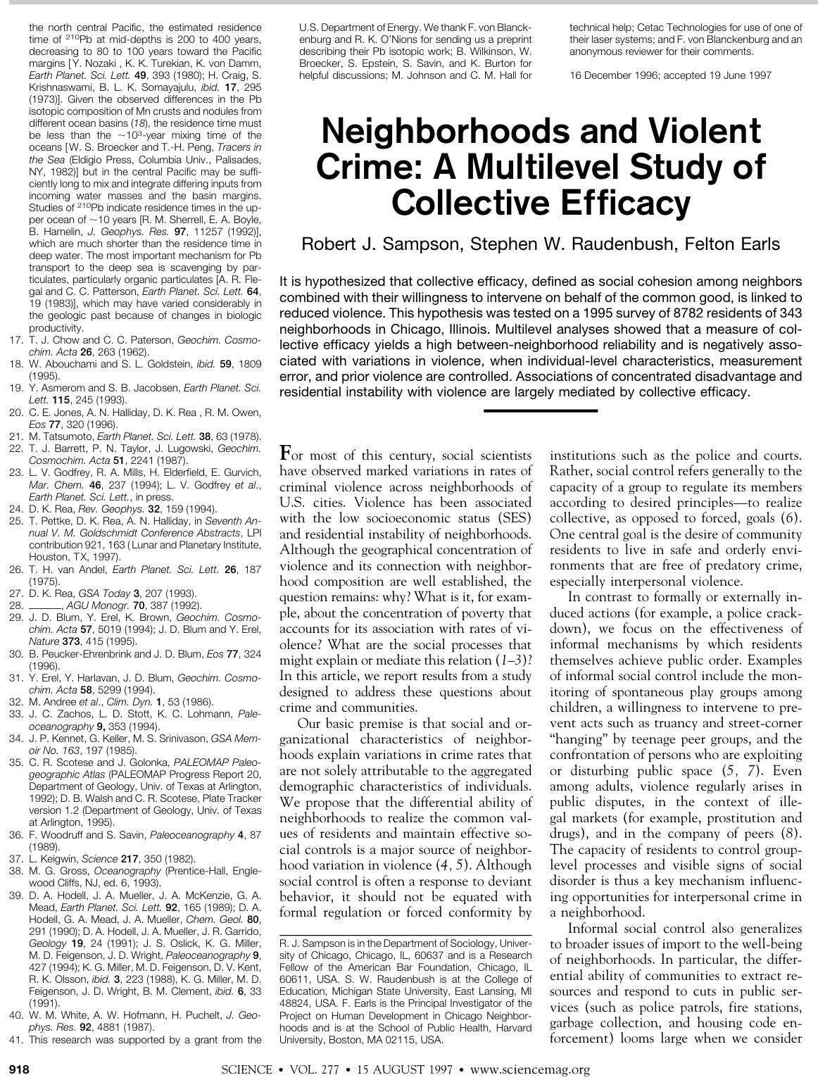 Multilevel analyses showed that a measure of collective efficacy yields a high between-neighborhood reliability and is negatively associated with variations in violence, when individual-level characteristics, measurement error, and prior violence are controlled. Associations of concentrated disadvantage and residential instability with violence are largely mediated by collective efficacy.