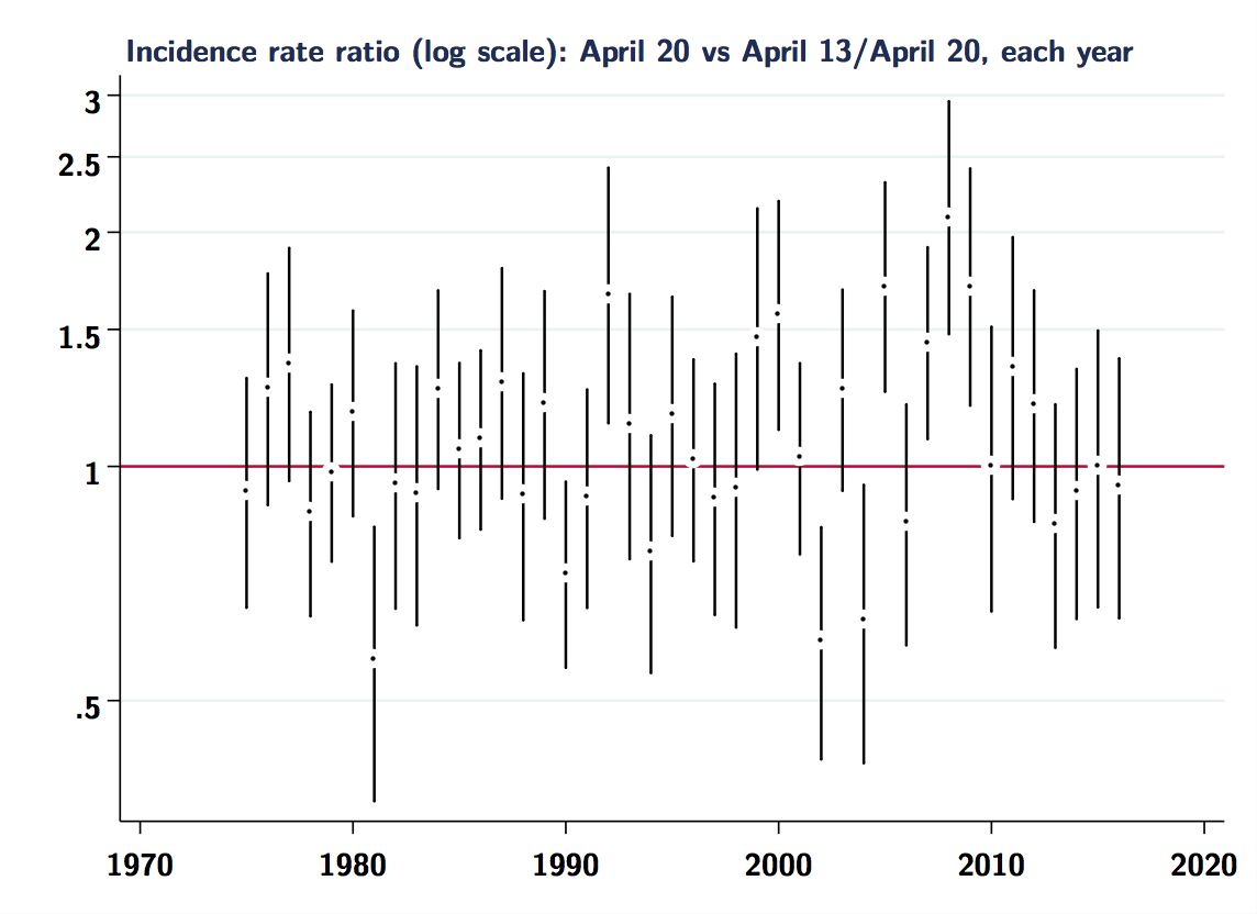 There is quite a lot of noise in these daily crash rate ratios, and few that appear reliably above or below the rates +/- one week. Although accounting for overdispersion leads to estimates for 4/20 that are not statistically distinguishable from the null (a distinction that we don’t think is meaningful), apparently there are several other days to worry about (excess deaths) and/or celebrate (reduced deaths):
